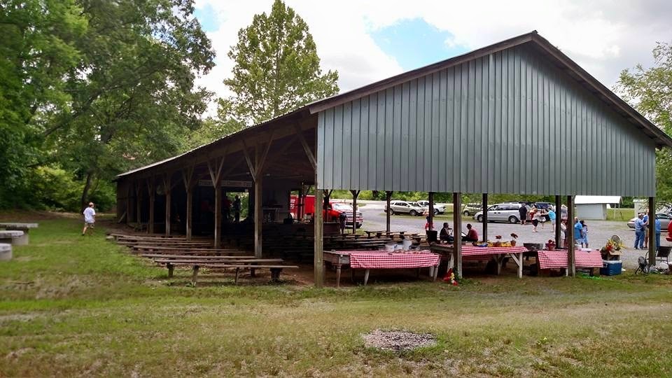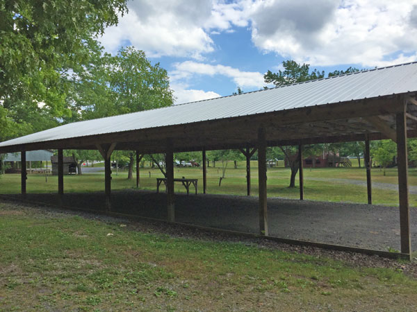 This open-air shelter with tin roof (30′ x 60′) has a gravel floor. You must provide your own tables and chairs.